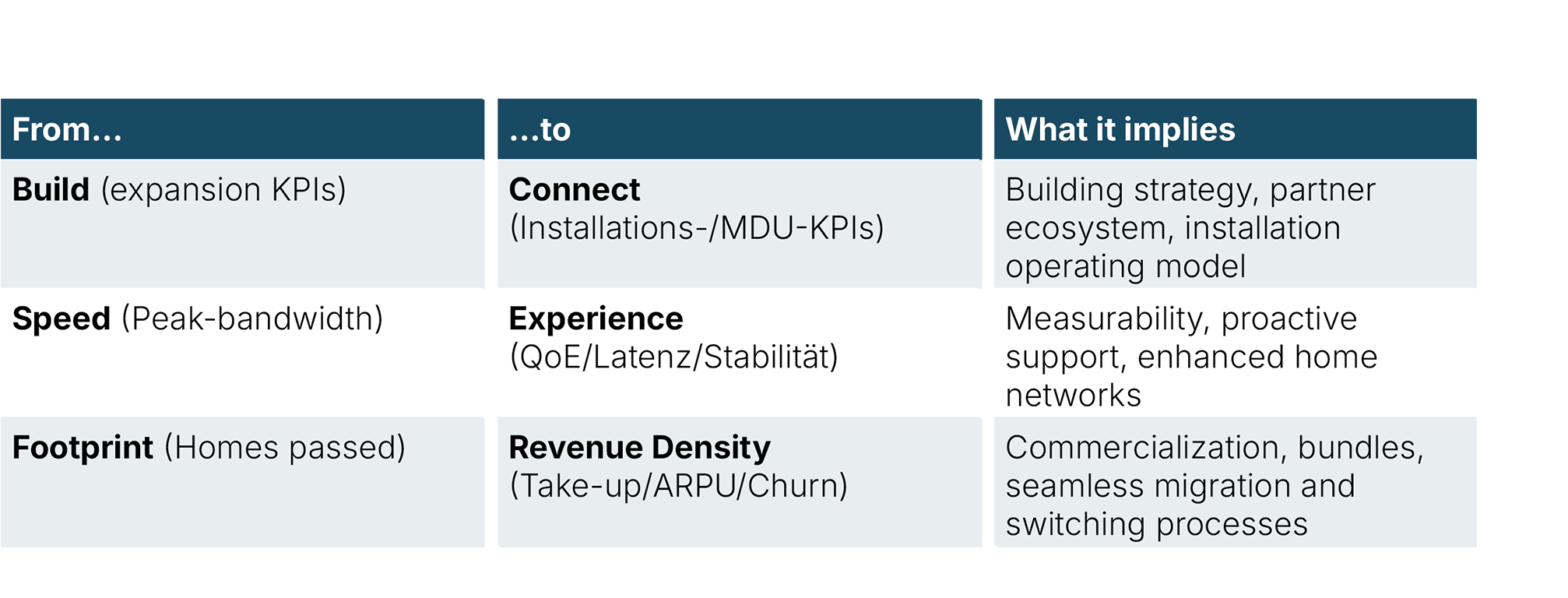 Take up is managed as a performance funnel and requires product, process, CPE, Wi Fi, and proactive support, not more construction meters. The copper-fiber-migration is a transformation program where customer experience, communications, operating model, and regulation are the multipliers. Winners pair an experience layer with connectivity plus content, because it scales revenue density, ARPU, and retention.